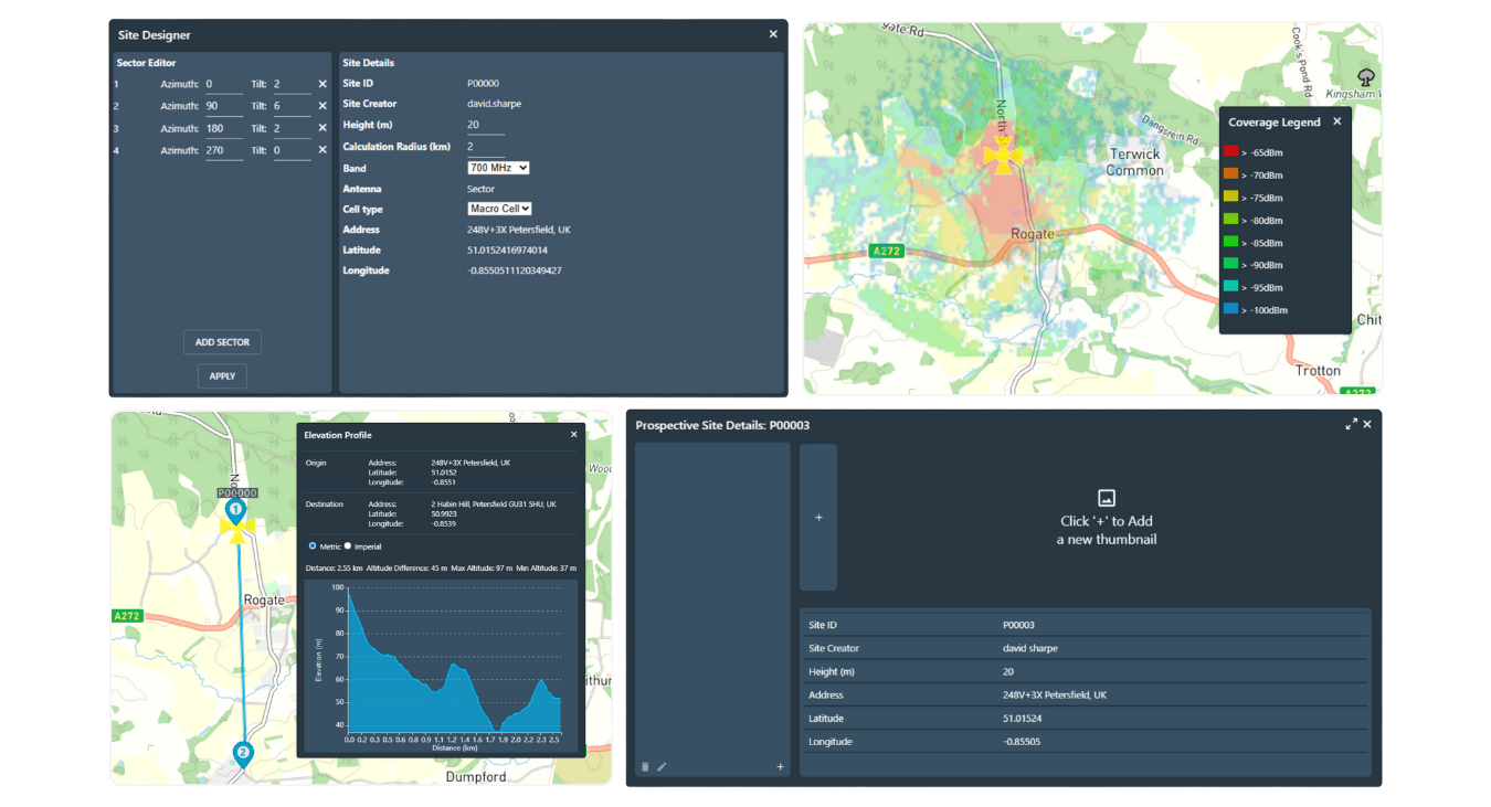 The "Prospective Sites" layer enables users to visually plan and analyse potential new sites directly on the map, without leaving the platform. Users can add and design sites with configurable sectors, azimuths, height, frequency band and cell type, with instant visual updates.