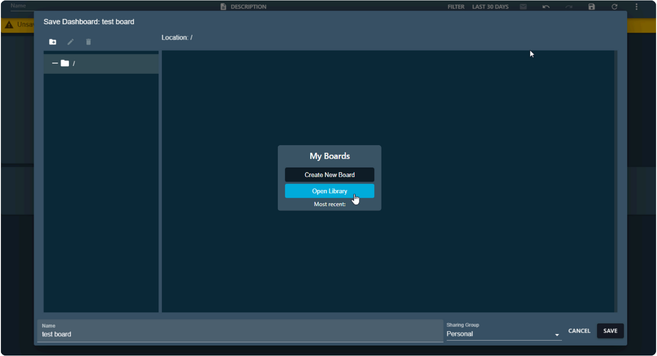 Custom Smartboards can now be saved to a library, enabling easier access and collaboration between teams. When saving a SmartBoard, users can choose to save to: